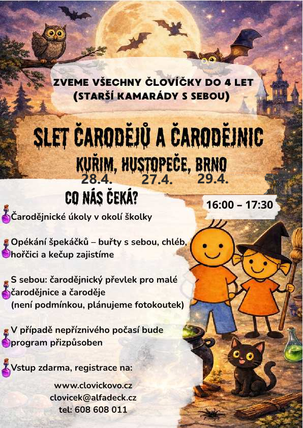 otevřená herna s připraveným programem, který můžete a nemusíte absolvovat, navíc volná hra v prostorách dětské skupiny (neplatí pro brněnský slet čarodějů)