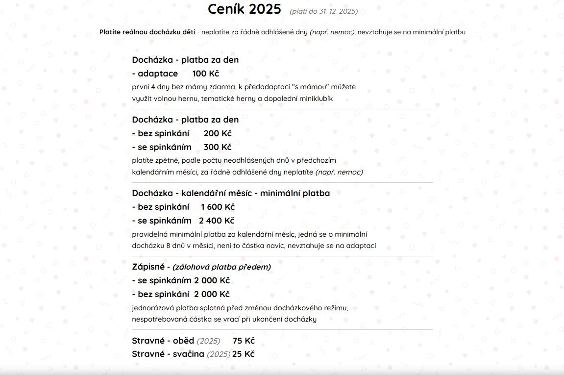Běháme, cvičíme, malujeme, zpíváme, tancujeme a čteme knížky, stavíme a bouráme domečky, věže i komíny, spravujeme auta, staráme se o panenky. Taky vaříme v naší kuchyňce, papírové palačinky a skoroopravdové hranolky.